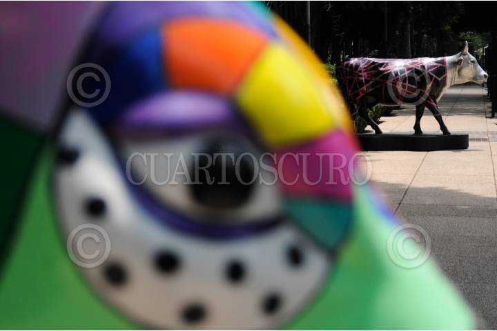 CIUDAD DE MÉXICO, 10JULIO2022.- Luego de 17 fuera del país, la CowParade volverá a ser expuesta sobre la Av. Paseo de la Reforma, donde decenas de figuras de vacas fueron intervenidas por artistas plásticos. Desde esta mañana, las personas que transitan por dicha avenida se toman fotografías junto a las figuras que permanecerán hasta agosto de este año. FOTO: DANIEL AUGUSTO /CUARTOSCURO.COM