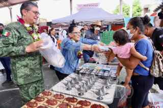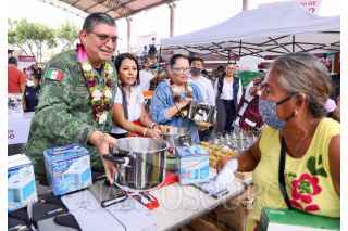 SAN PEDRO POCHUTLA, OAXACA, 13JULIO2022.- Luis Cresencio Sandoval, secretario de la Defensa Nacional; Rosa Icela Rodríguez, secretaria de Seguridad y Protección Ciudadana, y Adán Augusto López, secretario de Gobernación, encabezaron la entrega de bienes en el Tianguis del Bienestar instalado en San Pedro Pochutla a las familias afectadas por el huracán Agatha. FOTO: SECRETARÍA DE SEGURIDAD Y PROTECCIÓN CIUDADANA/CUARTOSCURO.COM