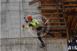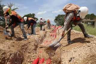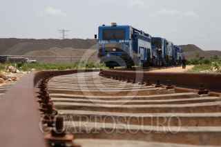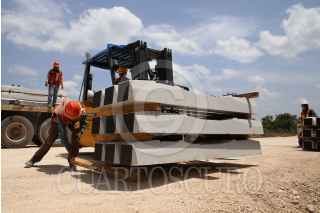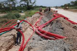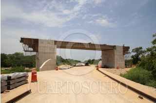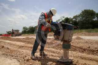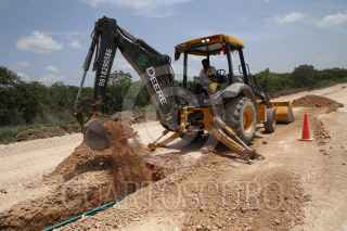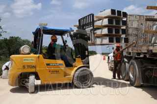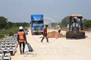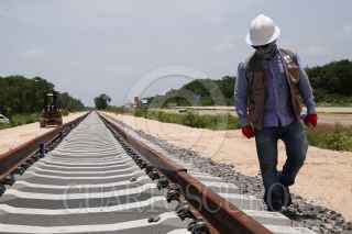 KOPOMA, YUCATÁN, 17JULIO2022.- En el tramo 3 que comprenden los municipios de Calkiní-Izamal, a la altura del municipio de Chocholá, trabajadores de la empresa Construcciones Urales, en asociación con GAMI Ingeniería e Instalaciones y AZVI, realizan el acomodo y armado de las vías férreas. Durante este tramo se observa el avance en la instalación de los registros subterráneos de energía eléctrica y la construcción de puentes vehiculares y pasos de fauna. Hace unos días llegaron de Europa las máquinas rodantes especiales para perfilar, nivelar y regularizar la capa de balasto en este tramo. FOTO: MARTÍN ZETINA/CUARTOSCURO.COM