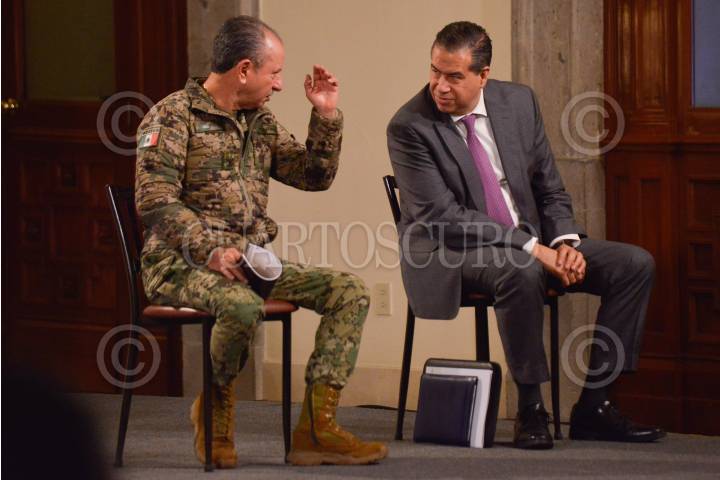 CIUDAD DE MÉXICO, 20JULIO2022.- Andrés Manuel López Obrador, presidente de México, encabezó la conferencia matutina realizada en Palacio Nacional. El mandatario estuvo acompañado de: Rosa Icela Rodríguez, secretaria de Seguridad y Protección Ciudadana; Luis Cresencio Sandoval, secretario de la Defensa Nacional; Rafael Ojeda Durán, secretario de Marina; Ana Elizabeth García Vilchis, directora de Redes de la Coordinación General de Comunicación Social y Vocería de Presidencia; Luis Rodríguez Bucio, Comandante de la Guardia Nacional, y Ricardo Mejía Berdeja, subsecretario de Seguridad Pública. FOTO: MARIO JASSO/CUARTOSCURO.COM