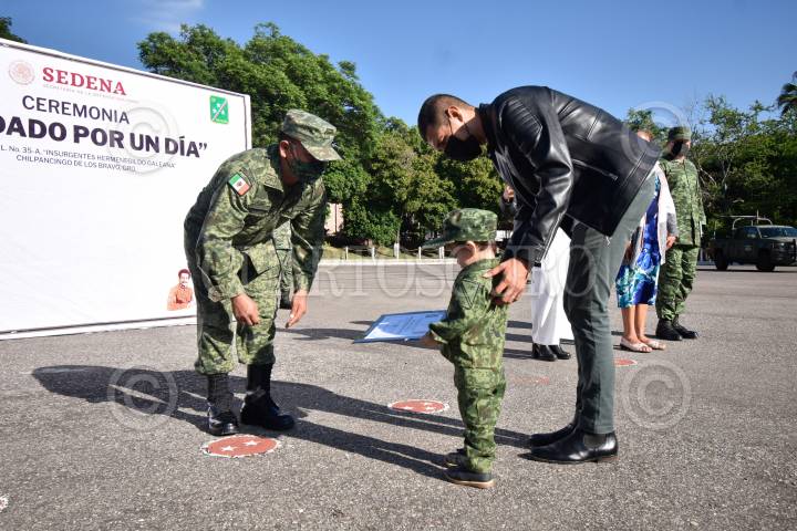 CHILPANCINGO, GUERRERO, 20JULIO2022.- Con tan solo 2 años de edad, Víctor Paul Jiménez Caballero ha sobrevivido a dos operaciones debido a que esta diagnosticado con Criptorquidia derecha de grado 2. Esto lo llevo a ser reconocido como 'Soldado por un día' en el 50vo Batallón de Infantería en Chilpancingo. Desde muy temprana hora, Pau, sus padres y abuelas, fueron trasladados desde su hogar a las instalaciones de la 35va Zona Militar. En donde los mandos militares hicieron entrega de la placa que lo avala como un elemento de la SEDENA, asimismo se celebró una ceremonia para entregarle el reconocimiento como soldado honorario. En entrevista, la madre de Paul dijo sentirse muy contenta de que su hijo se vistiera y se convirtiera en un soldado, ya que “es un guerrero desde antes que naciera, pues a enfrentado muchos pronósticos en contra”. FOTO: DASSAEV TÉLLEZ ADAME/CUARTOSCURO.COM