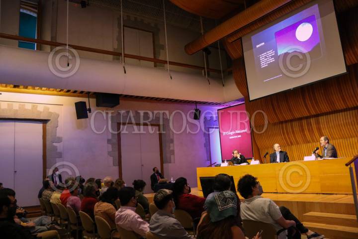 CIUDAD DE MÉXICO. 21JULIO2022.- José Gordon, Alejandro Frank y Juan Villoro en un conversario del Colegio Nacional, "la luna está ahí aunque no la miremos", al que acudieron decenas de personas. FOTO: VICTORIA VALTIERRA/CUARTOSCURO.COM