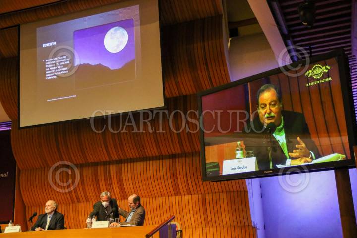 CIUDAD DE MÉXICO. 21JULIO2022.- José Gordon, Alejandro Frank y Juan Villoro en un conversario del Colegio Nacional, "la luna está ahí aunque no la miremos", al que acudieron decenas de personas. FOTO: VICTORIA VALTIERRA/CUARTOSCURO.COM