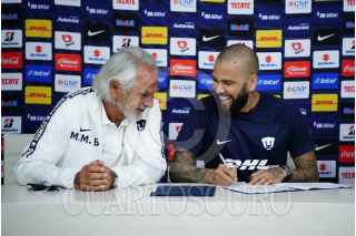 CIUDAD DE MÉXICO, 23JULIO2022.- Dani Alves, jugador brasileño, firmó como nuevo refuerzo de los Pumas de la UNAM. Lo acompañaron: Miguel Mejía Barón, vicepresidente deportivo del Club Pumas y Leopoldo Silva, presidente del Club Pumas. FOTO: PRENSA PUMAS/CUARTOSCURO.COM