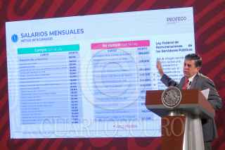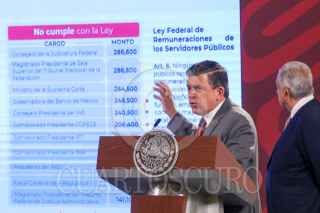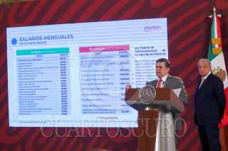 CIUDAD DE MÉXICO, 25JULIO2022.- Andrés Manuel López Obrador, Presidente de México, y Ricardo Sheffield Padilla, titular de Profeco, durante la mañanera en Palacio Nacional. En la cual se presentó el ¿Quién es quién?, en los salarios de funcionarios públicos, y se informó quien gana más que el Ejecutivo. FOTO: MOISÉS PABLO/CUARTOSCURO.COM