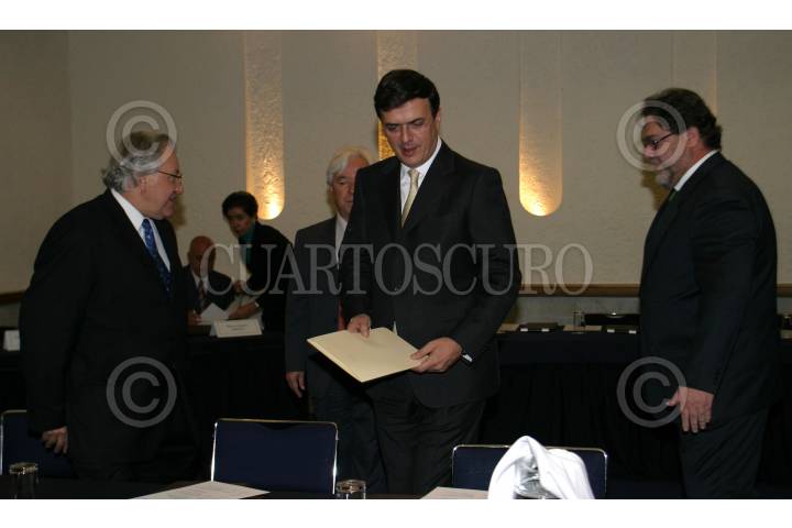 MEXICO, D.F. 22ENERO2007.- Axel Didricksson, Marcelo Ebrard Casaubom, jefe de gobierno de la ciudad de México conversa con Axel Didriksson durante y Luis Tiburcio, representante de la ONU a su llegada al Seminario Realizado por la UNESCO, Tema la Educación. FOTO: NELLY SALAS/CUARTOSCURO.COM