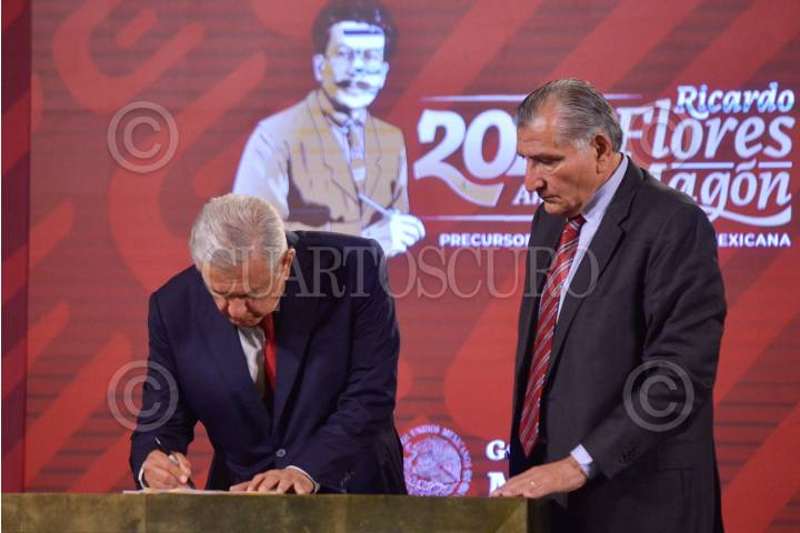 CIUDAD DE MÉXICO, 29JULIO2022.- Andrés Manuel López Obrador, presidente de México, encabezó la conferencia matutina realizada en Palacio Nacional, en la que presentó y firmó el decreto del reforzamiento de las acciones del Gobierno Federal en el Estado de Nuevo León para garantizar el abasto de agua. El mandatario estuvo acompañado de: Adán Augusto López, secretario de Gobernación; Germán Martínez Santoyo, director general de la Comisión Nacional del Agua (CONAGUA), y Agustín Radilla Suastegui, subsecretario de la Defensa Nacional. FOTO: MARIO JASSO/CUARTOSCURO.COM
