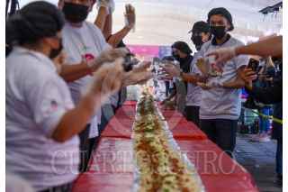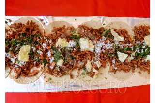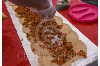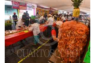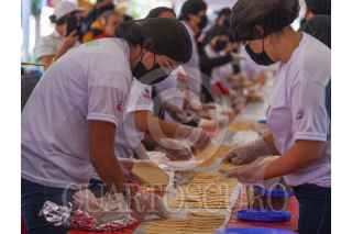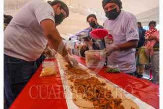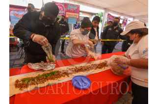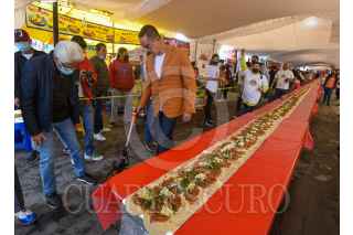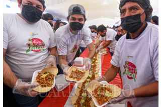 METEPEC, ESTADO DE MÉXICO, 31JULIO2022.- Durante la Primera Feria del Barro y del Taco se logró romper el récord del Taco Más Grande de México con 119.10 metros de largo, en donde se utilizaron 115 kilos de tortilla, una tonelada de carne al pastor, 80 kilos de cebolla y cilantro, y la participación de 115 personas para su elaboración en 5 minutos. FOTO: CRISANTA ESPINOSA AGUILAR /CUARTOSCURO.COM