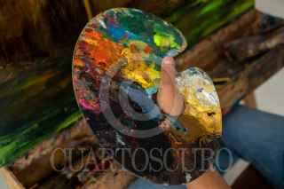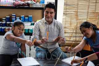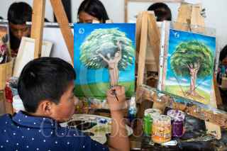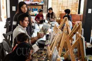 SAN JUAN CHAMULA, CHIAPAS, 01AGOSTO2022.- Tex López, artista originario de San Juan Chamula, creó un Centro Cultural y galería en la cabecera de este municipio en el cual ha iniciado talleres de pintura para niños, niñas y jóvenes, mostrando una opción diferente para las nuevas generaciones en el arte. Hoy en día la primera generación de artistas ya comparte sus conocimientos con los más jóvenes en ArtTex Casa de Cultura, muchos de ellos han vendido su obra y han ganado premios estatales. Ahora se encuentran expuestas en el Aeropuerto Albino Corzo en Chiapa de Corzo la obra de Tex, inaugurada con música tradicional, teniendo la oportunidad de mostrar la cultura Tzotzil de San Juan Chamula en México y el mundo. FOTO: ISABEL MATEOS/CUARTOSCURO.COM