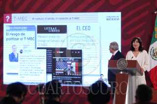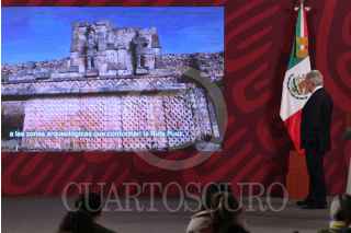CIUDAD DE MÉXICO, 03AGOSTO2022.- Andrés Manuel López Obrador, presidente de México acompañado Diego Prieto Hernández, director general del Instituto Nacional de Antropología e Historia y Ana Elizabeth García Vilchis durante conferencia de prensa en Palacio Nacional. FOTO: ANDREA MURCIA /CUARTOSCURO.COM