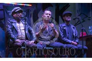 CIUDAD DE MÉXICO, 04AGOSTO2022.-Vocalista de la banda Comisario Pantera, Darío Vital, Iván Vidauri bajista y Roger Dávila; durante la conferencia de prensa para anunciar el Tour Instinto Felino. La gira empieza el próximo 14 de agosto en el Teatro Metropolitan. . FOTO: TOMAS ACOSTA / CUARTOSCURO.COM