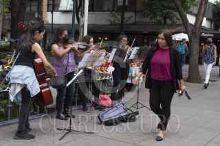 CIUDAD DE MÉXICO, 04AGOSTO2022.- Mujeres dan concierto en la Zona Rosa mientras los transeuntes trannsítan por la calle que conduce a la Glorieta de los Insurgentes. FOTO: TOMAS ACOSTA / CUARTOSCURO.COM