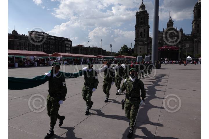 CIUDAD DE MÉXICO, 05AGOSTO2022.- Elementos de la Secretaría de la Defensa Nacional (SEDENA) realizan el arriamiento diario de la banda gigante del Zócalo capitalino. FOTO: GALO CAÑAS/CUARTOSCURO.COM