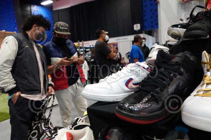 CIUDAD DE MÉXICO, 06AGOSTO2022.- Más de 100 expositores, marcas y artistas se dieron cita en el Pepsi Center para celebrar el primer día del Sneaker Fever, evento que reúne a coleccionistas, aficionados y seguidores de la cultura de los tenis. Entre los estantes se pueden encontrar zapatillas de las colaboraciones con cantantes como: Travis Scott, Billie Eilish y Eminem, por mencionar algunos. Así como colaboraciones con marcas de lujo como Louis Vuitton y Dior. Los precios van desde los 3000 pesos mexicanos y algunas de las piezas llegan a costar hasta más de 100 mil. FOTO: GALO CAÑAS/CUARTOSCURO.COM