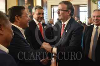 BOGOTÁ, COLOMBIA, 07AGOSTO2022.- A nombre del Gobierno y pueblo de México, el secretario de Relaciones Exteriores, Marcelo Ebrard Casaubon, externó sus felicitaciones y mejores deseos al nuevo presidente de la República de Colombia, Gustavo Petro, quien hoy tomó posesión del cargo. La doctora Beatriz Gutiérrez Müller, esposa del presidente de la República, Andrés Manuel López Obrador, y el canciller Ebrard acudieron hoy a la ceremonia de transmisión de mando, que tuvo lugar en la Plaza de Bolívar, en Bogotá. FOTO: SRE/CUARTOSCURO.COM