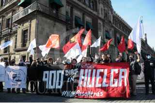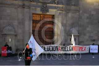 CIUDAD DE MÉXICO, 08AGOSTO2022.- El Sindicato Unido de Trabajadores de Notimex (SUTNOTIMEX) se manifestó afuera de Palacio Nacional luego de que se cumplieran 900 días de que la Agencia de Noticias del Estado entrara en huelga, los integrantes btincaron la valla y se colocaron frente a la Puerta Mariana de Palacio Nacional exigiendo una reunión con el presidente de México, Andrés Manuel López Obrador. FOTO: DANIEL AUGUSTO /CUARTOSCURO.COM