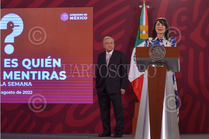 CIUDAD DE MÉXICO, 10AGOSTO2022.- Andrés Manuel López Obrador, presidente de México, encabezó conferencia matutina realizada en Palacio Nacional, en la que informó sobre la actualización del operativo de rescate a mineros que se continúan atrapados luego del derrumbe una mina de carbón en Coahuila. El mandatario estuvo acompañado de: Ana Elizabeth García Vilchis, directora de Redes de la Coordinación General de Comunicación Social y Vocería de Presidencia, quien presentó su sección "Quién es quién en las mentiras de la semana". FOTO: MARIO JASSO/CUARTOSCURO.COM