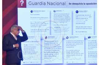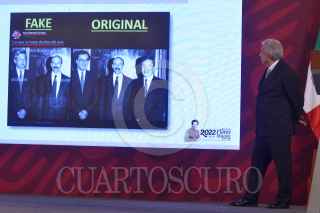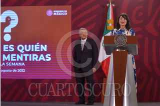 CIUDAD DE MÉXICO, 10AGOSTO2022.- Andrés Manuel López Obrador, presidente de México, encabezó conferencia matutina realizada en Palacio Nacional, en la que informó sobre la actualización del operativo de rescate a mineros que se continúan atrapados luego del derrumbe una mina de carbón en Coahuila. El mandatario estuvo acompañado de: Ana Elizabeth García Vilchis, directora de Redes de la Coordinación General de Comunicación Social y Vocería de Presidencia, quien presentó su sección "Quién es quién en las mentiras de la semana". FOTO: MARIO JASSO/CUARTOSCURO.COM