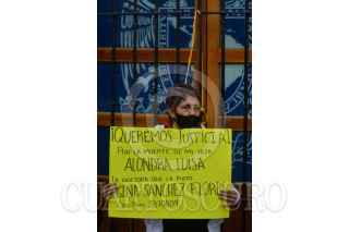 CIUDAD DE MÉXICO, 10AGOSTO2022.- Olivia Verónica Patiño y Miguel Ángel Mortier, padres de Alondra Luisa, quien presuntamente falleció por negligencia médica de la doctora Gina Sánchez Flores, se manifestaron sobre la calle Seminario en el centro histórico para exigir justicia. Olivia Verónica, como amenaza se sujetó el cuello con un lazo para que su demanda sea atendida. FOTO: MARIO JASSO/CUARTOSCURO.COM