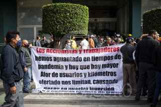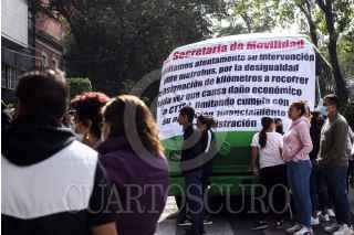 CIUDAD DE MÉXICO, 12AGOSTO2022.- Integrantes del Corredor Tepalcates Tacubaya S.A. de C.V. protestaron frente a las oficinas de la secretaría de Movilidad de la Ciudad de México, lo anterior para exigir que las autoridades repartan de manera equitativa el número de kilómetros en la rutas; comentaron que se les ha bajado el kilometraje y que han aumentado el número de unidades en circulación. FOTO: TOMAS ACOSTA / CUARTOSCURO.COM