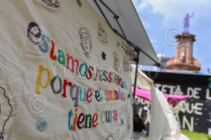 CIUDAD DE MÉXICO, 14AGOSTO2022.- Madres de víctimas de violencia y la colectiva Las siempre vivas se reunieron en la autonombrada Glorieta de Mujeres que Luchan en Paseo de la Reforma para realizar jornada de bordado previo a exposición colectiva que tendrán. Las mujeres buscan nombrar a sus familiares y otras mujeres desde el bordado. FOTO: ANDREA MURCIA /CUARTOSCURO.COM