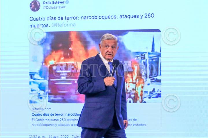 CIUDAD DE MÉXICO, 15AGOSTO2022.- Andrés Manuel López Obrador, Presidente de México; Ricardo Sheffield Padilla, titular de Profeco, y Delfina Gómez, secretaria de Educación Pública, durante la mañanera en Palacio Nacional. El mandatario inició hablando de los trabajos de rescate de los mineros del pozo de carbón El Pinabete, y de la jornada de violencia que vivieron ciudades como Ciudad Juárez y Tijuana, asegurando que medios como Reforma habían aprovechado para exagerar los hechos en la cantidad de personas muertas por estos hechos. FOTO: MOISÉS PABLO/CUARTOSCURO.COM