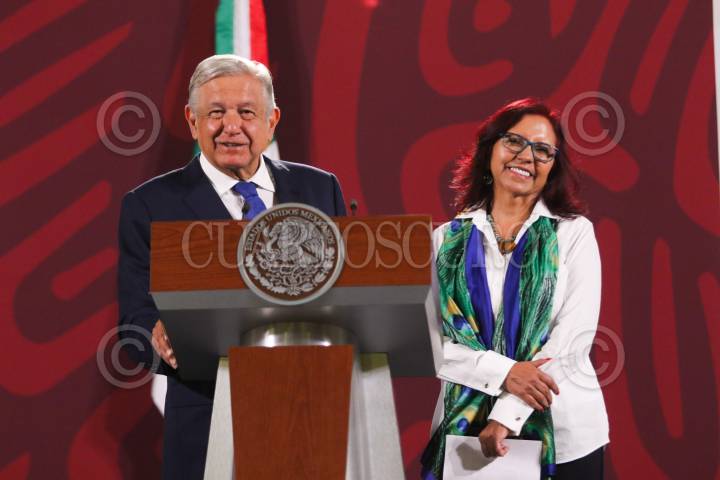 CIUDAD DE MÉXICO, 15AGOSTO2022.- Andrés Manuel López Obrador, Presidente de México; Ricardo Sheffield Padilla, titular de Profeco, y Delfina Gómez, secretaria de Educación Pública, durante la mañanera en Palacio Nacional. El mandatario inició hablando de los trabajos de rescate de los mineros del pozo de carbón El Pinabete, y de la jornada de violencia que vivieron ciudades como Ciudad Juárez y Tijuana, asegurando que medios como Reforma habían aprovechado para exagerar los hechos en la cantidad de personas muertas por estos hechos. FOTO: MOISÉS PABLO/CUARTOSCURO.COM
