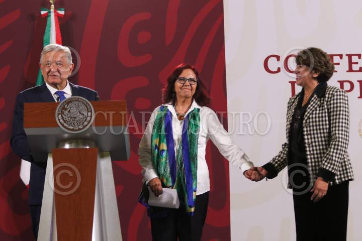 CIUDAD DE MÉXICO, 15AGOSTO2022.- Andrés Manuel López Obrador, Presidente de México; Ricardo Sheffield Padilla, titular de Profeco, y Delfina Gómez, secretaria de Educación Pública, durante la mañanera en Palacio Nacional. El mandatario inició hablando de los trabajos de rescate de los mineros del pozo de carbón El Pinabete, y de la jornada de violencia que vivieron ciudades como Ciudad Juárez y Tijuana, asegurando que medios como Reforma habían aprovechado para exagerar los hechos en la cantidad de personas muertas por estos hechos. FOTO: MOISÉS PABLO/CUARTOSCURO.COM