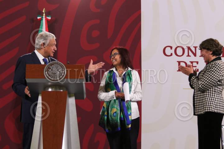 CIUDAD DE MÉXICO, 15AGOSTO2022.- Andrés Manuel López Obrador, Presidente de México; Ricardo Sheffield Padilla, titular de Profeco, y Delfina Gómez, secretaria de Educación Pública, durante la mañanera en Palacio Nacional. El mandatario inició hablando de los trabajos de rescate de los mineros del pozo de carbón El Pinabete, y de la jornada de violencia que vivieron ciudades como Ciudad Juárez y Tijuana, asegurando que medios como Reforma habían aprovechado para exagerar los hechos en la cantidad de personas muertas por estos hechos. FOTO: MOISÉS PABLO/CUARTOSCURO.COM