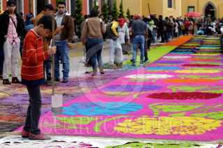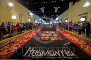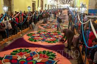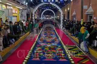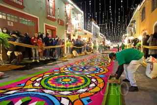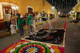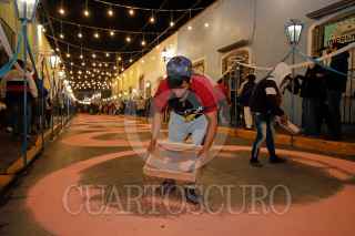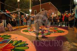 HUAMANTLA, TLAXCALA, 15AGOSTO2022.- Artesanos colocaron alfombras de aserrín para los festejos de la Virgen de la Caridad en la llamada "Noche que Nadie Duerme" en Huamantla, Tlaxcala. Dicha celebración fue engalanada por la obtención del récord Guinness al tapete de aserrín más grande del mundo con una longitud de 3932.6 metros de largo, reconocimiento que fue recibido por la gobernador Lorena Cuéllar Cisneros. FOTO: MIREYA NOVO/ CUARTOSCURO.COM