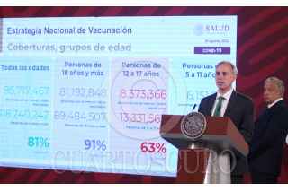 CIUDAD DE MÉXICO, 16AGOSTO2022.- Andrés Manuel López Obrador, presidente de México acompañado de Hugo López-Gatell Ramírez, subsecretario de Prevención y Promoción de la Salud y Zoé Robledo Aburto, director general del Instituto Mexicano del Seguro Social (IMSS) durante conferencia matutina dedicada al tema de la Salud. FOTO: ANDREA MURCIA /CUARTOSCURO.COM
