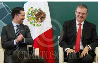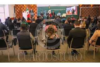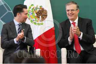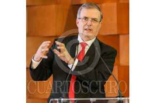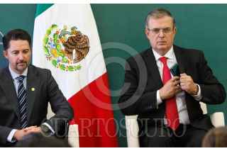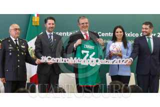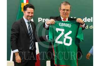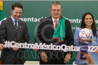 CIUDAD DE MÉXICO. 16AGOSTO2022.- Yon de Luisa, de la FMF; el canciller Marcelo Ebrard y la arbitro Karen Díaz en la presentación de "Qatar Centro México 2022, en la secretaria de Relaciones Exteriores. FOTO: VICTORIA VALTIERRA/CUARTOSCURO.COM