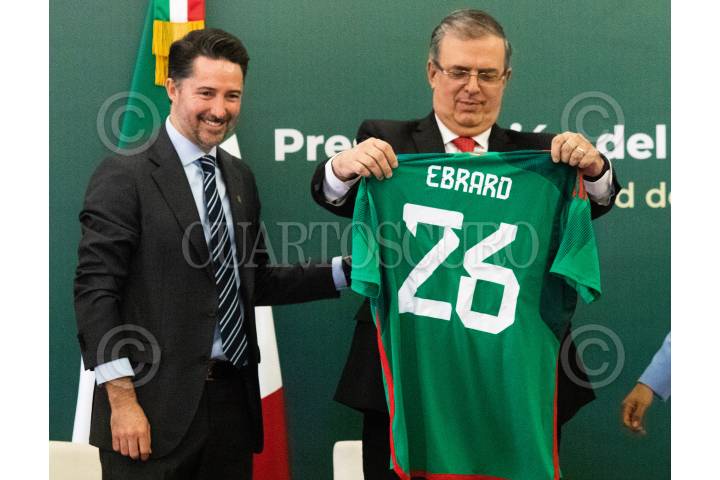 CIUDAD DE MÉXICO. 16AGOSTO2022.- Yon de Luisa, de la FMF; el canciller Marcelo Ebrard y la arbitro Karen Díaz en la presentación de "Qatar Centro México 2022, en la secretaria de Relaciones Exteriores. FOTO: VICTORIA VALTIERRA/CUARTOSCURO.COM