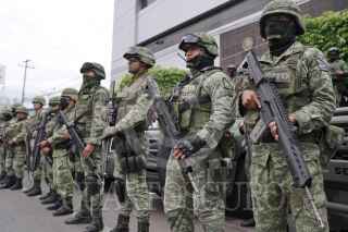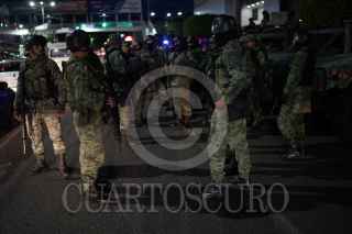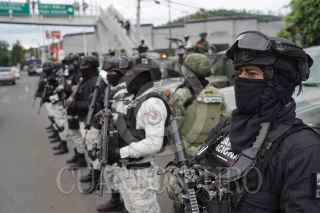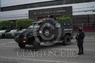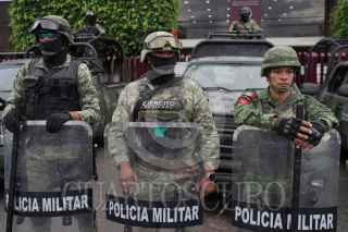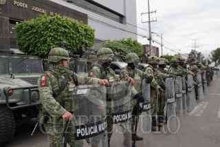 MORELIA, MICHOACÁN, 16AGOSTO2022.- Fuerzas federales y estatales reforzaron la seguridad en los juzgados en Morelia, donde se lleva a cabo la audiencia de los 164 integrantes del Pueblos Unidos de Michoacán. Cientos de elementos de la Secretaría de la Defensa Nacional, entre ellos de la Policía Militar, así como de la Guardia Nacional y del grupo antimotines de la Secretaría de Seguridad Pública de la entidad se apostaron frente al edificio del Poder Judicial de la Federación en la capital de Michoacán. FOTO: JUAN JOSÉ ESTRADA SERAFÍN /CUARTOSCURO.COM
