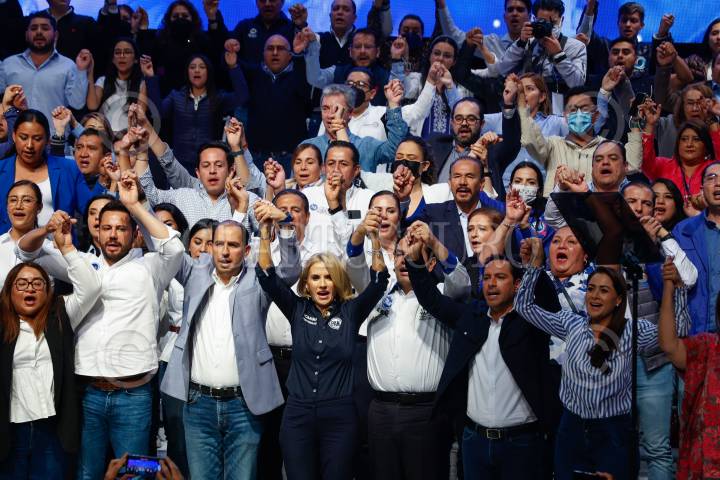 OLUCA, ESTADO DE MÉXICO, 21AGOSTO2022.- La militancia panista sostuvo un encuentro con Enrique Vargas del Villar, quien estuvo acompañado por Markos Cortés Presidente Nacional del PAN, los gobernadores Querétaro, Yucatán, Guanajuato, Mauricio Kuri González, Mauricio Vila y Diego Sinhué Rodríguez, así como la gobernadora electa de Aguascalientes María Teresa Jiménez, Santiago Creel Miranda, la Senadora Xóchitl Gálvez, presidentes municipales, diputados federales y locales, en donde convocó a los panistas a buscar la gubernatura del Estado de México, a trabajar de manera coordinada para ganar las elecciones del 2023 que se llevó a cabo en el Teatro Morelos.FOTO: CRISANTA ESPINOSA AGUILAR /CUARTOSCURO.COM