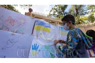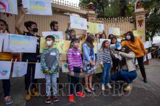 CIUDAD DE MÉXICO, 23AGOSTO2022.- Niños y niñas en compañía de sus padres y demás manifestantes, se dieron cita frente a las instalaciones de la Embajada Rusa en México; para exigir a las autoridades del Kremlin en Moscú el cese de la intervención en Ucrania. En dicho evento se colocó un tendedero con dibujos realizados por niños y niñas, en ellos se observan mensajes en los que pide paz para que la niñez ucraniana pueda crecer en un ambiente adecuado; estos dibujos se obtuvieron a raíz de una convocatoria realizada por el Partido de la Revolución Democrática. A la manifestación también acudió el diputado Rafael Acosta Ángeles mejor conocido como "Juanito". FOTO: TOMAS ACOSTA / CUARTOSCURO.COM