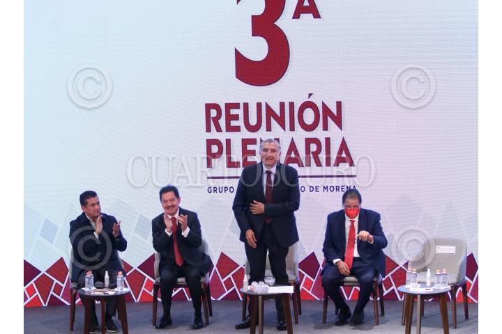 CIUDAD DE MÉXICO, 25AGOSTO2022.- Ignacio Mier Velazco, coordinador del grupo parlamentario Morena; Adán Augusto, secretario de Gobernación; Rosa Icela Rodríguez Velázquez, secretaria de Seguridad y Protección Ciudadana; Ricardo Mejía Berdeja, subsecretario de seguridad; Carlos Alberto Puente, Partido verde y Reginaldo Sandoval Flores, Partido del Trabajo(PT) durante la inauguración de la 3era plenaria de Morena. FOTO: ANDREA MURCIA /CUARTOSCURO.COM