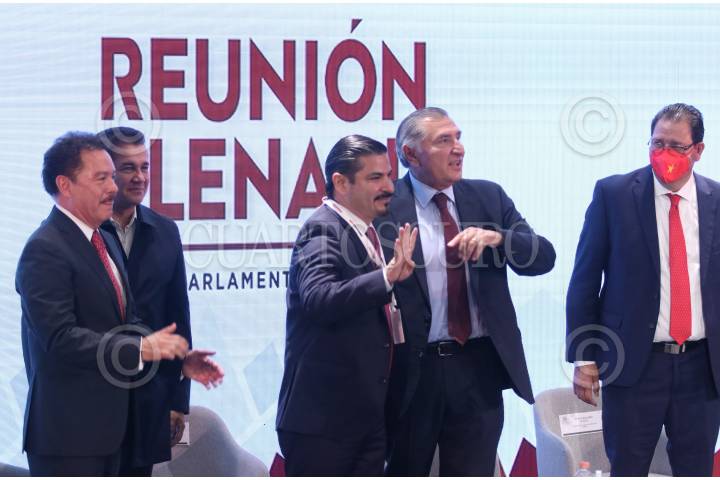CIUDAD DE MÉXICO, 25AGOSTO2022.- Ignacio Mier Velazco, coordinador del grupo parlamentario Morena; Adán Augusto, secretario de Gobernación; Rosa Icela Rodríguez Velázquez, secretaria de Seguridad y Protección Ciudadana; Ricardo Mejía Berdeja, subsecretario de seguridad; Carlos Alberto Puente, Partido verde y Reginaldo Sandoval Flores, Partido del Trabajo(PT) durante la inauguración de la 3era plenaria de Morena. FOTO: ANDREA MURCIA /CUARTOSCURO.COM
