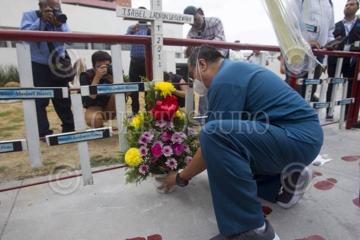 MONTERREY, NUEVO LEÓN, 25AGOSTO2022.- Tras once años del ataque al Casino Royale, donde murieron 52 personas; familiares se reúnen en las afueras del lugar para conmemorar a las víctimas con flores, huellas y cruces con los nombres de cada uno de los fallecidos. FOTO: GABRIELA PÉREZ MONTIEL / CUARTOSCURO.COM