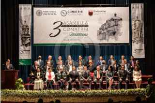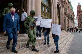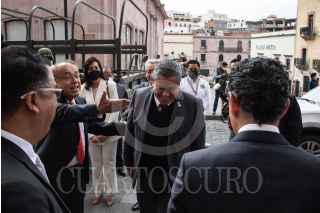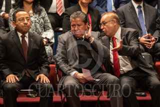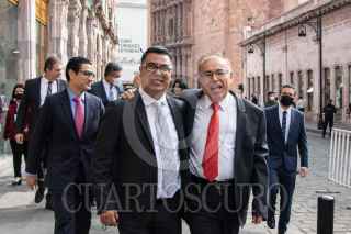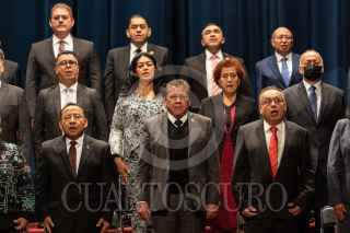 ZACATECAS, ZACATECAS, 26AGOSTO2022.- Arturo Nahle García, magistrado presidente del Tribunal Superior de Justicia del Estado (TSJEZ); Rafael Guerra Álvarez, magistrado presidente del Tribunal Superior de Justicia de la Ciudad de México y presidente de la CONATRIB; y David Monreal Ávila, gobernador del Estado; presidieron la inauguración de la 3era Asamblea Plenaria de la Comisión Nacional de Tribunales Superiores de Justicia de los Estados Unidos Mexicanos, realizado en el Teatro Calderón de la capital zacatecana. Al final de la ceremonia tres mujeres se apostaron a la entrada con denuncias por hostigamiento laboral en el Poder Judicial estatal. FOTO: GENARO NATERA /CUARTOSCURO.COM