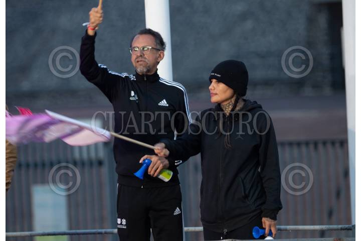 CIUDAD DE MÉXICO, 28AGOSTO2022.- Javier Ariel Hidalgo Ponce, director de INDEPORTE y la Barbie Juárez dieron el banderazo de salida de la primera ronda del maratón de la Ciudad que arranco a las 6:45 de la mañana en estadio Olímpico Universitario con meta en el Zócalo Capitalino. FOTO: ANDREA MURCIA /CUARTOSCURO.COM