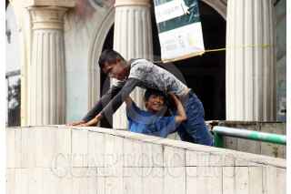 CUERNAVACA, MORELOS, 28AGOSTO2022.- Una pareja de hermanos se divierten jugando en la rampa de la clínica de IMSS donde esperan que se les aplique la vacuna contra el Covid-19. FOTO: MARGARITO PÉREZ RETANA / CUARTOSCURO.COM