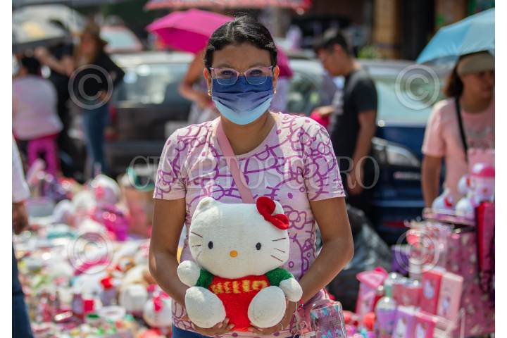 CIUDAD DE MÉXICO, 28AGOSTO2022.- Lía es una de las muchas mujeres con bazares en linea que se promocionaban principalmente por grupos en Facebook y que entregaban en el metro Chabacano, al llegar la pandemia y aplicarse las medidas sanitarias también según Lía se aprovecho para criminalizarlas y sacarlas del metro. Al intentar entregar afuera de este les mandaban policías para impedirlo, por lo que optaron por organizarse en colectiva y así hace un año comienza lo que hoy es el Tianguis de Hello Kitty en Chabacano, el cual actualmente cuenta con permiso de la alcaldía Cuauhtémoc y horario de 11 a 4 de la tarde todos los sábados. Así que cada sábado Lía se transporta desde Atizapan Edo. Mex. para vender sus productos de la gatita más famosa del mundo. A veces lleva a su hija pero otras puede dejarla con su marido. “Para mi ser bazareña ha sido una bendición porque las mujeres que conozco a través de esto tienen historias fuertes de resiliencia y fuerza, ellas también se han convertido en mi red de apoyo. Aparte siempre he amado a Hello Kitty, a veces entre nosotras mismas nos truekeamos o compramos cosas. Es un trabajo con matices, sí, pero en en su mayoría me ha dejado cosas buenas. También tener la oportunidad de resistir sin ser criminalízada ha sido algo positivo” comenta Lía. FOTO: ANDREA MURCIA /CUARTOSCURO.COM
