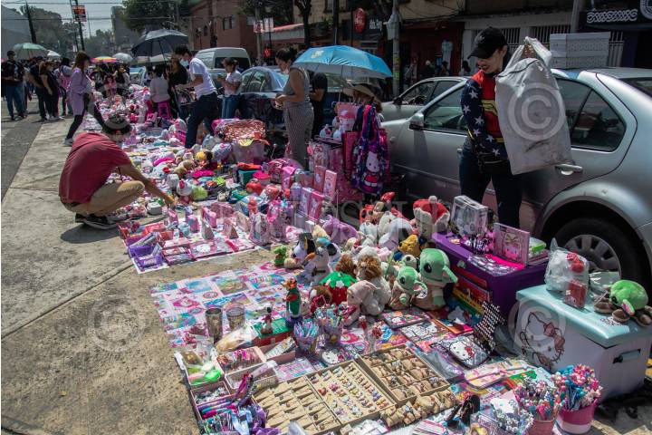 CIUDAD DE MÉXICO, 28AGOSTO2022.- Lía es una de las muchas mujeres con bazares en linea que se promocionaban principalmente por grupos en Facebook y que entregaban en el metro Chabacano, al llegar la pandemia y aplicarse las medidas sanitarias también según Lía se aprovecho para criminalizarlas y sacarlas del metro. Al intentar entregar afuera de este les mandaban policías para impedirlo, por lo que optaron por organizarse en colectiva y así hace un año comienza lo que hoy es el Tianguis de Hello Kitty en Chabacano, el cual actualmente cuenta con permiso de la alcaldía Cuauhtémoc y horario de 11 a 4 de la tarde todos los sábados. Así que cada sábado Lía se transporta desde Atizapan Edo. Mex. para vender sus productos de la gatita más famosa del mundo. A veces lleva a su hija pero otras puede dejarla con su marido. “Para mi ser bazareña ha sido una bendición porque las mujeres que conozco a través de esto tienen historias fuertes de resiliencia y fuerza, ellas también se han convertido en mi red de apoyo. Aparte siempre he amado a Hello Kitty, a veces entre nosotras mismas nos truekeamos o compramos cosas. Es un trabajo con matices, sí, pero en en su mayoría me ha dejado cosas buenas. También tener la oportunidad de resistir sin ser criminalízada ha sido algo positivo” comenta Lía. FOTO: ANDREA MURCIA /CUARTOSCURO.COM