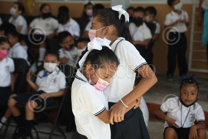 VILLAHERMOSA, TABASCO, 29AGOSTO2022.- Autoridades estatales de Educación anunciaron que en este regreso a clases del nuevo ciclo escolar 22-23, en educación básica arrancaron con una matrícula de 527 mil cuarenta y ocho educando, 22 mil quinientos cuarenta y cuatro profesores en las cinco mil 103 escuelas que tiene Tabasco. Los escolares acudieron al plantel de manera segura, con cubre bocas, se abrazaron en un recuentro y otros buscaron protección en su maestra. FOTO: CARLOS CANABAL OBRADOR/CUARTOSCURO.COM