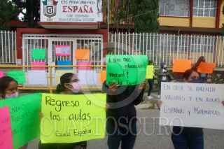 OAXACA, OAXACA 29AGOSTO2022.- Padres de familia de la escuela primaria urbana España ubicada en la capital de Oaxaca, se manifestaron para exigir que se inicien clases presenciales en la institución, acusaron que el director Joaquín Solano Moguel se niega al retorno a las aulas afirmando que no hay condiciones por la pandemia de covid-19, pese a que la autoridad educativa determinó el inicio del ciclo escolar 2022 - 2023 de forma presencial en Oaxaca. FOTO: CAROLINA JIMÉNEZ/CUARTOSCURO.COM