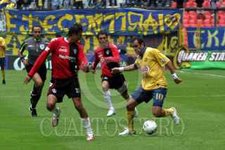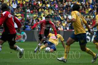 MÉXICO, D.F., 04FEBRERO2007.- El delantero de los Zorros del Atlas, Nicolas Olivera, se quita la marca de Nelson Cuevas, de las Aguilas del América, durante el primer tiempo del encuentro realizado en el Estadio Azteca, el cual está hasta el momento empatado a ceros. FOTO: ISAAC ESQUIVEL/CUARTOSCURO.COM