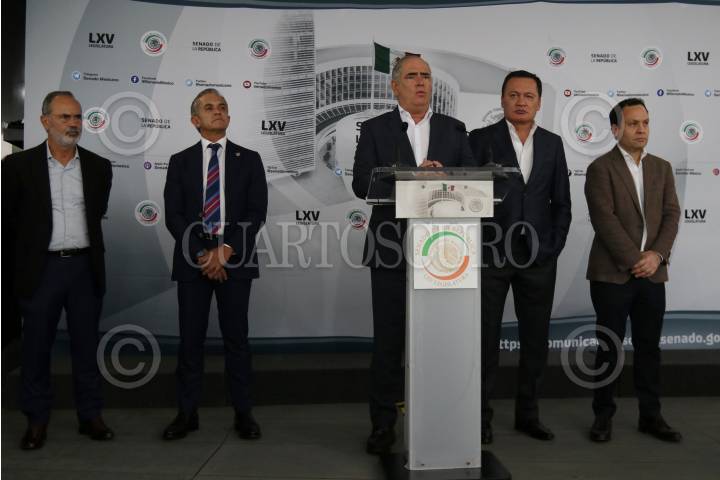 CIUDAD DE MÉXICO, 31AGOSTO2022. - Los coordinadores Miguel Ángel Mancera PRD, Miguel Osorio Chong PRI, Julem Rementeria PAN, Emilio Alvarez Icaza independiente, Clemente Castañeda Movimiento Ciudadano ofrecieron conferencia de prensa para mostrar su desacuerdo con la decisión de Morena sobre su candidato para la Mesa directiva. FOTO: ANDREA MURCIA /CUARTOSCURO.COM