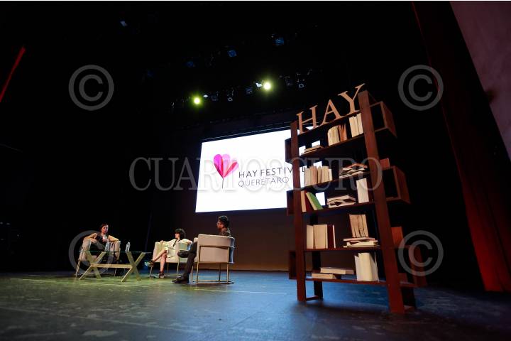 QUERÉTARO, QUERÉTARO, 02SEPTIEMBRE2022.- Amanda de la Garza, historiadora y curadora el arte; Lorena Wolffer, artista y activista cultural, y Joseph Zarate, periodista y editor de origen peruano, durante el segundo día de actividades del Hay Festival Querétaro. FOTO: CÉSAR GÓMEZ/CUARTOSCURO.,COM