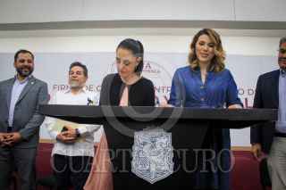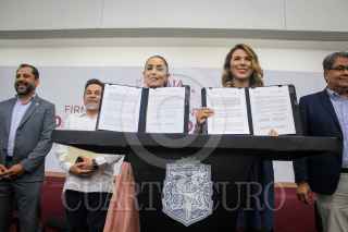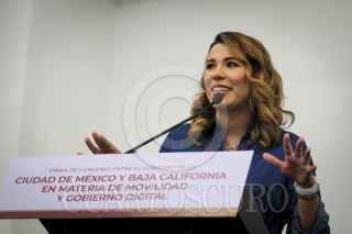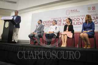 TIJUANA, BAJA CALIFORNIA, 03SEPTIEMBRE2022.-Esta mañana se llevó a cabo la firma de convenios en materia de Movilidad y Gobierno Digital entre el Gobierno del Estado de Baja California y el Gobierno de la Ciudad de México. El evento fue realizado en las instalaciones del Grand Hotel TIjuana, ubicado en el Blvd. Agua Caliente. Donde asistieron como presidium, el director Digital Juan Alberto Gutiérrez, Alfonso Millán presidente de CANAR, la Gobernadora de Baja California, Marina del Pilar y la Jefa de Gobierno de la Ciudad de México, la Dr. Claudia Sheinbaum Pardo. Con pancartas y gritos, personas empatizantes con la labor de la Jefa de gobierno de la Ciudad de México, la recibieron de manera fraternal. La mandataria dió un discurso donde habló sobre los avances que han tenido en el desarrollo de movilidad en la ciudad y afirmó que cuentan con el cable bus más grande del mundo. Posteriormente se realizó la firma del Convenio por parte del gobierno de Baja California y la Ciudad de México, en el cual se planea se logre solucionar algunas problemáticas del Estado en materia de los temas. Finalmente la Gobernadora Marina del Pilar, declaró lo agradecida y emocionada que estaba por la visita de la mandataria Sheinbaum, quien comentó que tiene un gran afecto por el estado, ya que cuenta con familia residiendo en Ensenada. FOTO: OMAR MARTÍNEZ /CUARTOSCURO.COM